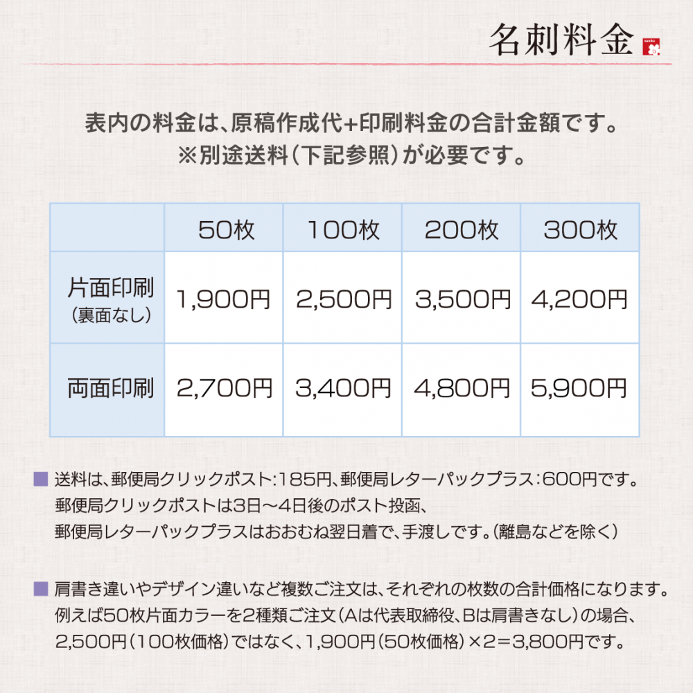 *同じデザインでも、肩書き違いなど原稿内容が異なる場合は、2種類分をご注文ください。